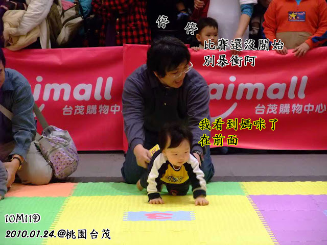 不過,當我們進入比賽場地後,聰明頭就整個清醒了,我們的策略是,爸比跟聰明頭在起點,媽媽我在終點等待。大俠剛把聰明頭放到地墊上時,聰明頭往前左看右看,好像在熟悉場地,我也很努力的在揮手,希望聰明頭可以看到我,結果,聰明頭這次有看到我了,一整個非常興奮,高興的想直奔敢快爬過來,而大俠也差點抓不住他,畢竟比賽哨聲還沒吹,可不能先偷跑爬阿~
